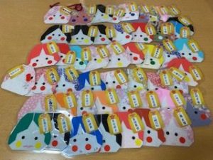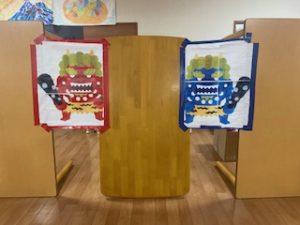 手作りの鬼の的へ目掛けてお手玉で”鬼は外!!!”